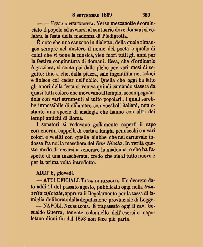 E noto che una canzone in dialetto, della quale riman-gon sempre nel mistero il nome del poeta e quello di colui che vi pone la musica, vien fuori tutti gli anni per la festiva congiuntura di domani. Essa, che d'ordinario è graziosa, si canta poi dalla plebe per vari mesi di seguito: fino a che, dalla piazza, sale ingentilita nei saloni e finisce col cader nell'oblio. Quella che oggi ha fatto gli onori della festa sì veniva quindi cantando stasera da quasi tutti coloro che movevano al tempio, accompagnandola con vari strumenti al tutto popolari, i quali sarebbe impossibile di cliiamare con vocaboli italiani, non o-stante una specie di analogia che hanno con altri dei tempi antichi di Roma.