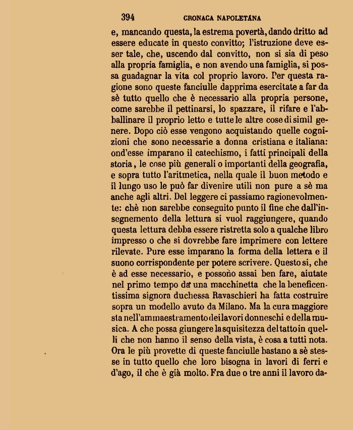 e, mancando questa, la estrema povertà, dando dritto ad essere educate in questo convitto; l'istruzione deve esser tale, che, uscendo dal convitto, non si sia di peso alla propria famiglia, e non avendo una famiglia, si possa guadagnar la vita col proprio lavoro. Per questa ragione sono queste fanciulle dapprima esercitate a far da sè tutto quello che è necessario alla propria persone, come sarebbe il pettinarsi, lo spazzare, il rifare e l'abballinare il proprio letto e tutte le altre cose di simil genere. Dopo ciò esse vengono acquistando quelle cognizioni che sono necessarie a donna cristiana e italiana: ond'esse imparano il catechismo, i fatti principali della storia, le cose più generali o importanti della geografia, e sopra tutto l'aritmetica, nella quale il buon metodo e il lungo uso le può far divenire utili non pure a sè ma anche agli altri. Del leggere ci passiamo ragionevolmente: chè non sarebbe conseguito punto il fine che dall'in-segnemento della lettura si vuol raggiungere, quando questa lettura debba essere ristretta solo a qualche libro impresso o che si dovrebbe fare imprimere con lettere rilevate. Pure esse imparano la forma della lettera e il suono corrispondente per potere scrivere. Questo si, che è ad esse necessario, e possono assai ben fare, aiutate nel primo tempo dar una macchinetta che la beneficen-t ss i ma signora duchessa Ravaschieri ha fatta costruire sopra un modello avuto da Milano. Ma la cura maggiore sta nell'ammaestramento deilavori donneschi e della musica. A che possa giungere la squisitezza del tatto in quelli che non hanno il senso della vista, è cosa a tutti nota. Ora le più provette di queste fanciulle bastano a sè stesse in tutto quello che loro bisogna in lavori di ferri e d'ago, il che è già molto. Fra due o tre anni il lavoro da-