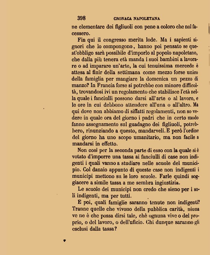 Non cosi per la seconda parte di esso con la quale si è votato d'imporre una tassa ai fanciulli di case non indigenti i quali vanno a studiare nelle scuole del municipio. Col danaio appunto di queste case non indigenti i municipi mettono su le loro scuole. Farle quindi soggiacere a simile tassa a me sembra ingiustizia.