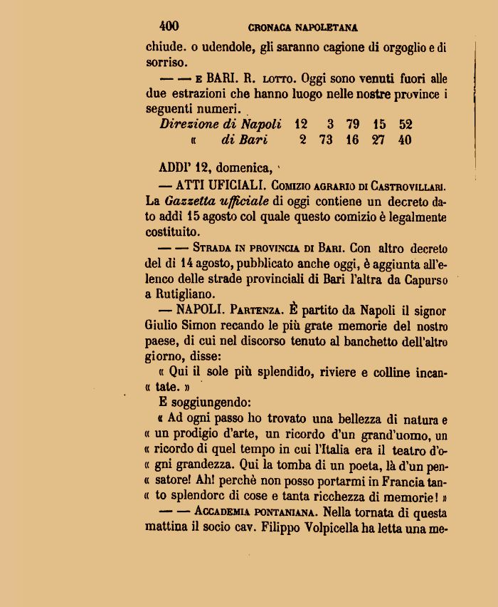Direzione di Napoli 12 3 79 15 52 « di Bari 2 73 16 27 40
