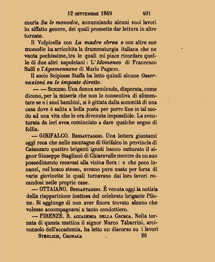 — GIRIFALCO. Brigantaggio. Una lettera giuntami oggi reca che nelle montagne di Girifalco in provincia di Catanzaro quattro briganti ignoti hanno catturato il signor Giuseppe Stagliano di Chiaravalle mentre da un suo possedimento recavasi alla vicina fiera : e che poco innanzi, nel bosco stesso, aveano pure usato per forza di varie giovinette le quali tornavano dai loro lavori recandosi nelle proprie case.
