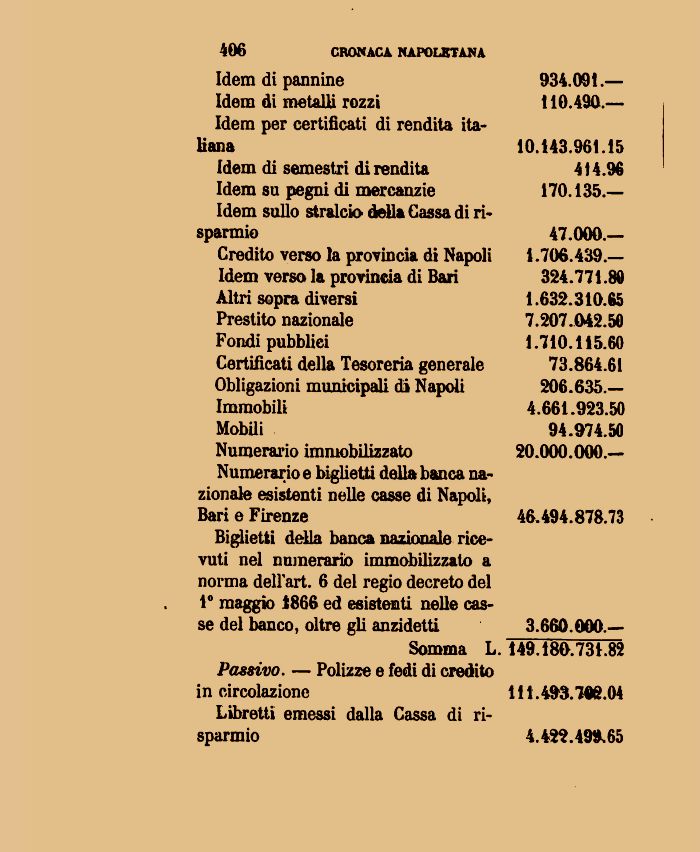 Idem di pannine 934.091.— Idem di metalli rozzi 110.490.— Idem per certificati di rendita italiana 10.143.961.15 Idem di semestri di rendita 414.96 Idem su pegni di mercanzie 170.135.— Idem sullo stralcio della Gassa di risparmio 47.000.— Credito verso la provincia di Napoli 1.706.439.— Idem verso la provincia di Bari 324.771.80 Altri sopra diversi 1.632.310.65 Prestito nazionale 7.207.042.50 Fondi pubblici 1.710.115.60 Certificati della Tesoreria generale 73.864.61 Obligazioni municipali di Napoli 206.635.— Immobili 4.661.923.50 Mobili 94.974.50 Numerario immobilizzato 20.000.000.— Numerario e biglietti della banca nazionale esistenti nelle casse di Napoli, Bari e Firenze 46.494.878.73