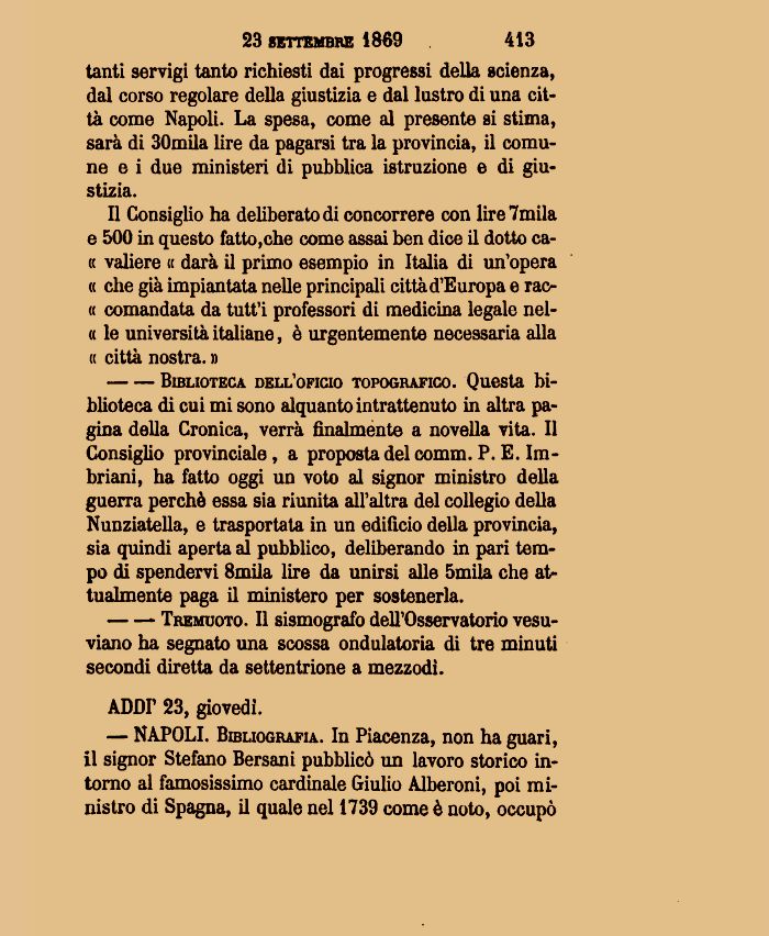 tanti servigi tanto richiesti dai progressi della scienza, dal corso regolare della giustizia e dal lustro di una città come Napoli. La spesa, come al presente si stima, sarà di 30mila lire da pagarsi tra la provincia, il comune e i due ministeri di pubblica istruzione e di giustizia.