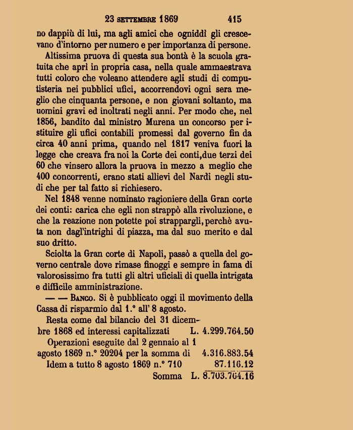 Altissima pruova di questa sua bontà è la scuola gratuita che aprì in propria casa, nella quale ammaestrava tutti coloro che voleano attendere agli studi di computisteria nei pubblici ufìci, accorrendovi ogni sera meglio che cinquanta persone, e non giovani soltanto, ma uomini gravi ed inoltrati negli anni. Per modo che, nel 1856, bandito dal ministro Murena un concorso per i-stituire gli ufici contabili promessi dal governo fin da circa 40 anni prima, quando nel 1817 veniva fuori la legge che creava fra noi la Corte dei conti,due terzi dei 60 che vinsero allora la pruova in mezzo a meglio che 400 concorrenti» erano stati allievi del Nardi negli studi che per tal fatto si richiesero.