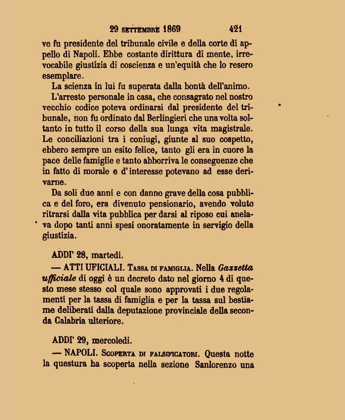 Da soli due anni e con danno grave della cosa pubblica e del foro, era divenuto pensionano, avendo voluto ritrarsi dalla vita pubblica per darsi al riposo cui anelava dopo tanti anni spesi onoratamente in servigio della giustizia.