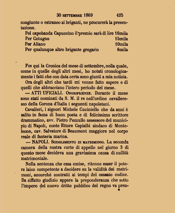 Cavalieri, i signori Michele Cuciniello che da anni è salito in fama di buon poeta e di felicissimo scrittore drammatico, avv. Pietro Pezzullo assessore del municipio di Napoli, conte Ettore Capialbi sindaco dì Monte-leone, cav. Salvatore di Beaumont maggiore nel corpo reale di fanteria marina.