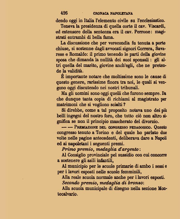 congresso tenuto a Torino e del quale ho parlato due volte nelle pagine antecedenti, deliberava dare a Napoli ed ai napoletani i seguenti premi. Primo premio, medaglia d'argento : Al Consiglio provinciale pel sussidio con cui concorre a sostenere gli asili infantili,