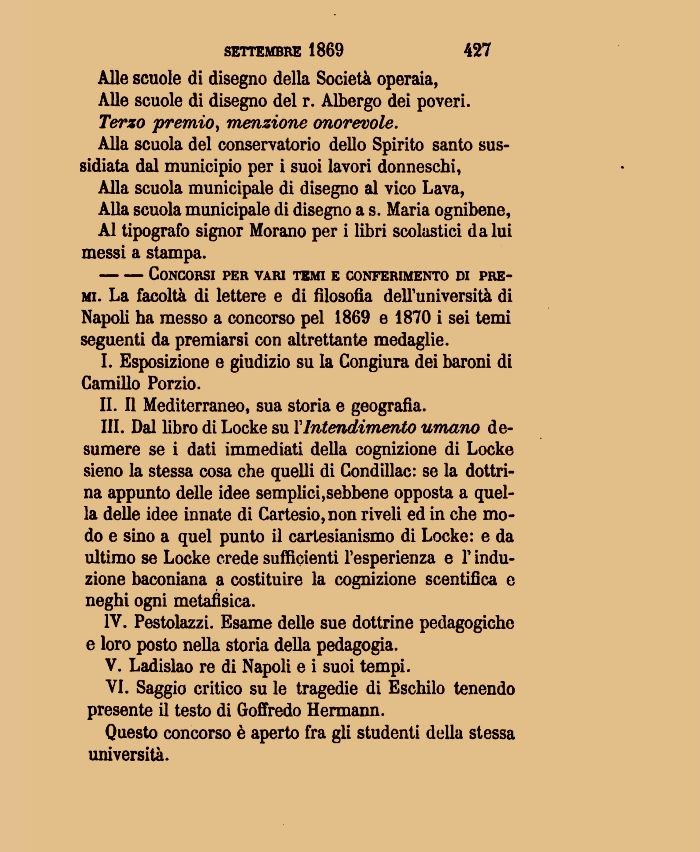 --Concorsi per vari temi e conferimento di premi. La facoltà di lettere e di filosofia dell'università di Napoli ha messo a concorso pel 1869 e 1870 i sei temi seguenti da premiarsi con altrettante medaglie.