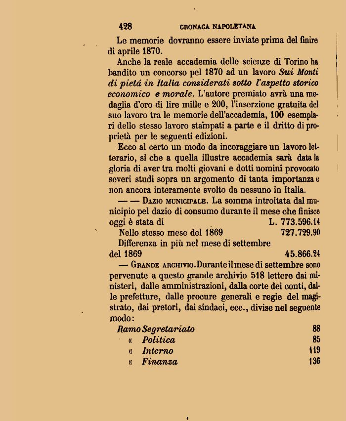 Anche la reale accademia delle scienze di Torino ha bandito un concorso pel 1870 ad un lavoro Siti Monti di pietà in Italia considerati sotto l'aspetto storico economico e morale. L'autore premiato avrà una medaglia d'oro di lire mille e 200, l'inserzione gratuita del suo lavoro tra le memorie dell'accademia, 100 esemplari dello stesso lavoro stampati a parte e il dritto di proprietà per le seguenti edizioni.