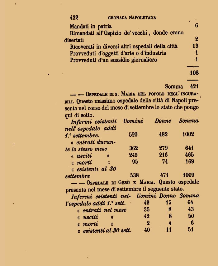 --Ospedale di s. Maria del popolo degl' incurabili. Questo massimo ospedale della città di Napoli presenta nel corso del mese di settembre lo stato che pongo qui di sotto.