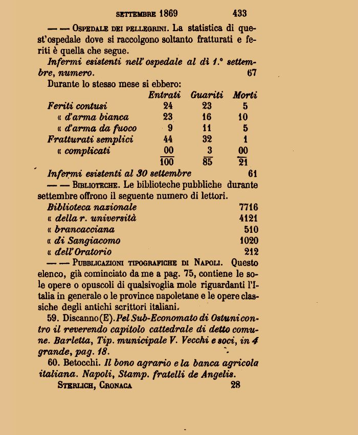 --Ospedale dei pellegrini. La statìstica dì quest'ospedale dove si raccolgono soltanto fratturati e feriti è quella che segue.