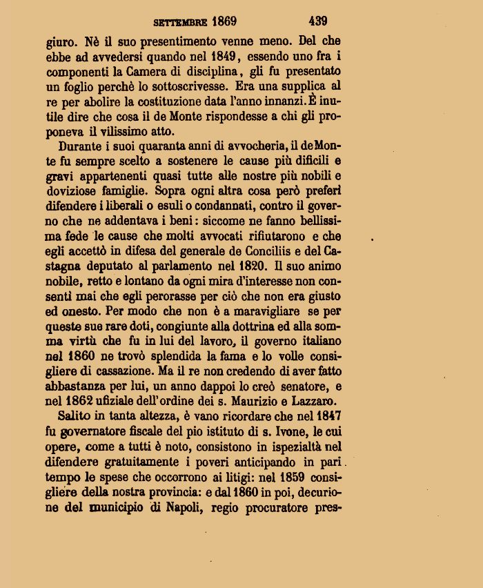 giuro. Nè il suo presentimento venne meno. Del che ebbe ad avvedersi quando nel 1849, essendo uno fra i componenti la Camera di disciplina, gli fu presentato un foglio perchè lo sottoscrivesse. Era una supplica al re per abolire la costituzione data l'anno innanzi. E inutile dire che cosa il de Monte rispondesse a chi gli proponeva il vilissimo atto.