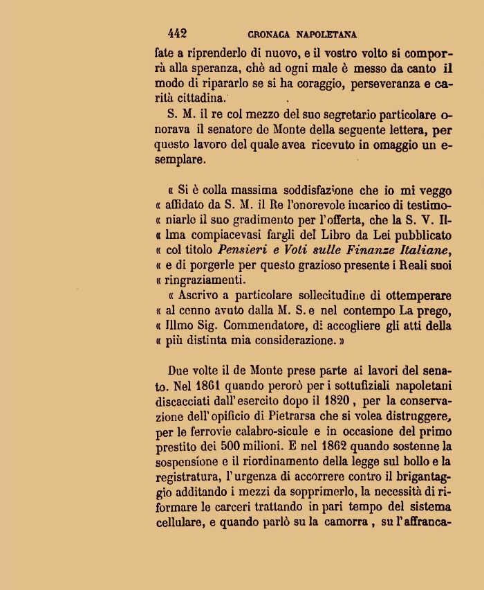 S. M. il re col mezzo del suo segretario particolare o-norava il senatore de Monte della seguente lettera, per questo lavoro del quale avea ricevuto in omaggio un e-semplare.
