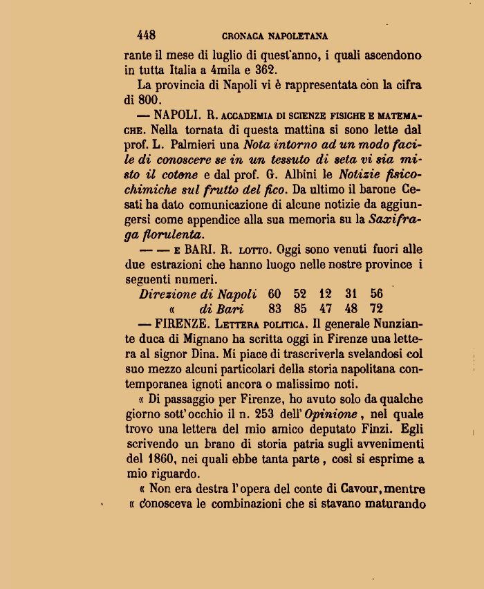 che. Nella tornata di questa mattina si sono lette dal prof. L. Palmieri una Nota intorno ad un modo facile di conoscere se in un tessuto di seta vi sia misto il cotone e dal prof. G. Albini le Notizie fisico-chimiche sul frutto del fico. Da ultimo il barone Cesati ha dato comunicazione di alcune notizie da aggiungersi come appendice alla sua memoria su la Saxifraga flomlenta.