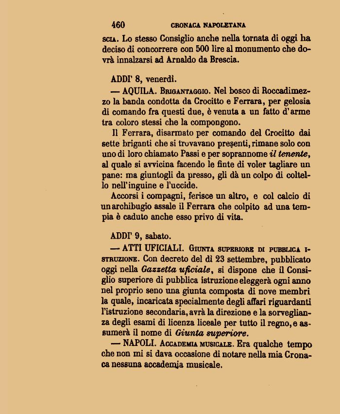 — AQUILA. Brigantaggio. Nel bosco di Roccadimez-zo la banda condotta da Crocitto e Ferrara, per gelosia di comando fra questi due, è venuta a un fatto d'arme tra coloro stessi che la compongono.