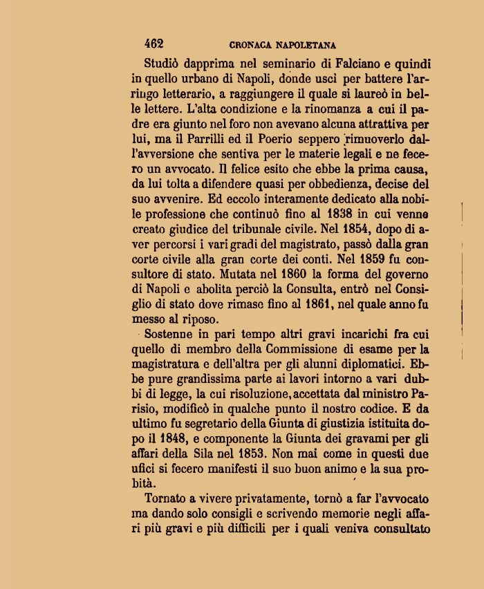 Studiò dapprima nel seminario di Falciano e quindi in quello urbano di Napoli, donde usci per battere l'arringo letterario, a raggiungere il quale si laureò in belle lettere. L'alta condizione e la rinomanza a cui il padre era giunto nel foro non avevano alcuna attrattiva per lui, ma il Parrilli ed il Poerio seppero rimuoverlo dall'avversione che sentiva per le materie legali e ne fecero un avvocato. Il felice esito che ebbe la prima causa, da lui tolta a difendere quasi per obbedienza, decise del suo avvenire. Ed eccolo interamente dedicato alla nobile professione che continuò fino al 1838 in cui venne creato giudice del tribunale civile. Nel 1854, dopo di a-ver percorsi i vari gradi del magistrato, passò dalla gran corte civile alla gran corte dei conti. Nel 1859 fu consultore di stato. Mutata nel 1860 la forma del governo di Napoli e abolita perciò la Consulta, entrò nel Consiglio dì stato dove rimase fino al 1861, nel quale anno fu messo al riposo.
