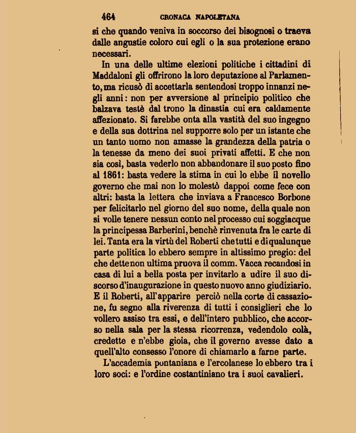 In una delle ultime elezioni politiche i cittadini di Maddaloni gli offrirono la loro deputazione al Parlamento, ma ricusò di accettarla sentendosi troppo innanzi negli anni : non per avversione al principio politico che balzava testé dal trono la dinastia cui era caldamente affezionato. Si farebbe onta alla vastità del suo Ingegno e della sua dottrina nel supporre solo per un istante che un tanto uomo non amasse la grandezza della patria o la tenesse da meno dei suoi privati affetti. E che non sia cosi, basta vederlo non abbandonare il suo posto fino al 1861: basta vedere la stima in cui lo ebbe il novello governo che mai non lo molestò dappoi come fece con altri: basta la lettera che inviava a Francesco Borbone per felicitarlo nel giorno del suo nome, della quale non si volle tenere nessun conto nel processo cui soggiacque la principessa Barberini, benché rinvenuta fra le carte di lei. Tanta era la virtù del Roberti che tutti e di qualunque parte politica lo ebbero sempre in altissimo pregio: del che dette non ulti ma pruova il comm. Vacca recandosi in casa di lui a bella posta per invitarlo a udire il suo discorso d'inaugurazione in questo nuovo anno giudiziario. E il Roberti, all'apparire perciò nella corte di cassazione, fu segno alla riverenza di tutti i consiglieri che lo vollero assiso tra essi, e dell'intero pubblico, che accorso nella sala per la stessa ricorrenza, vedendolo colà, credette e n'ebbe gioia, che il governo avesse dato a quell'alto consesso l'onore di chiamarlo a farne parte.