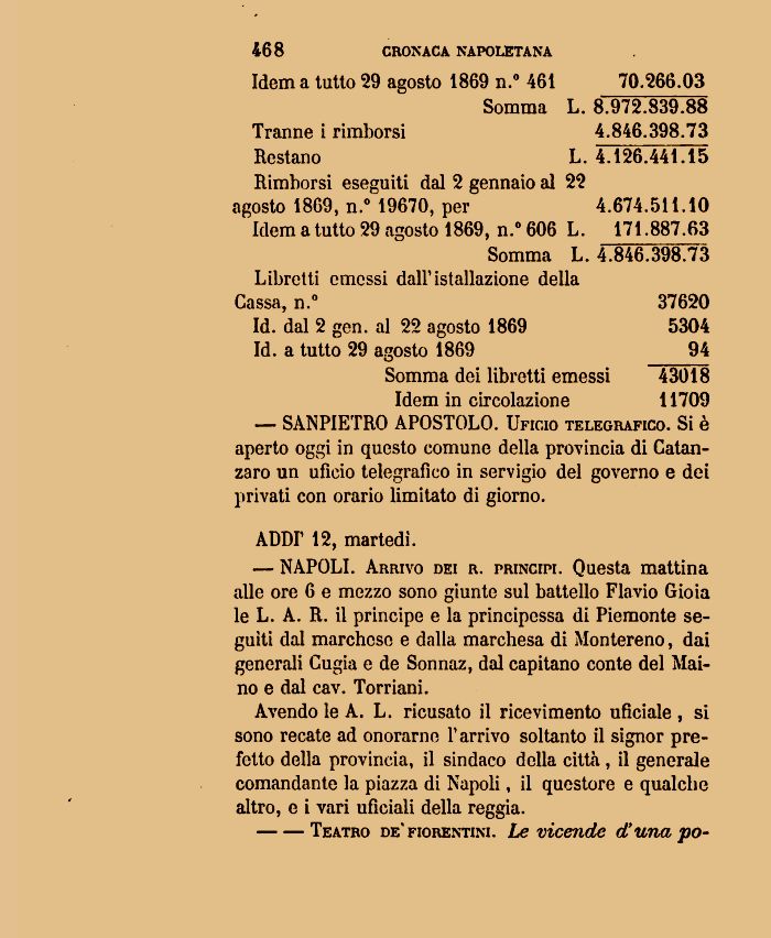 — NAPOLI. Arrivo dei r. principi. Questa mattina alle ore 6 e mezzo sono giunte sul battello Flavio Gioia le L. A. R. il principe e la principessa di Piemonte seguiti dal marchese e dalla marchesa di Montereno, dai generali Cugia e de Sonnaz, dal capitano conte del Maino e dal cav. Torriani.