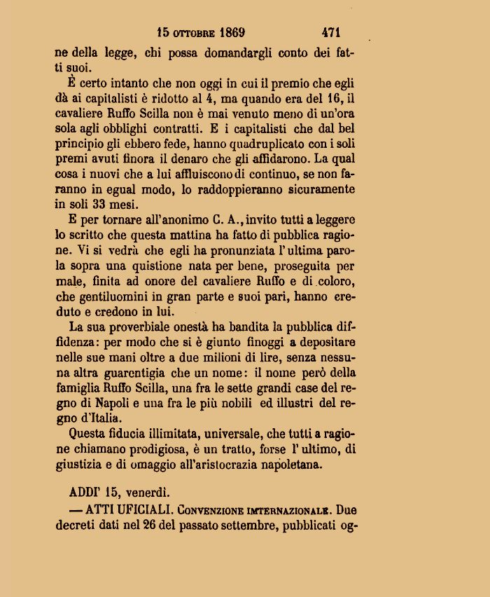 E certo intanto che non oggi in cui il premio che egli dà ai capitalisti è ridotto al 4, ma quando era del 16, il cavaliere Ruffo Scilla non è mai venuto meno di un'ora sola agli obblighi contratti. E i capitalisti che dal bel principio gli ebbero fede, hanno quadruplicato con i soli premi avuti finora il denaro che gli affidarono. La qual cosa ì nuovi che a luì affluiscono di continuo, se non faranno in egual modo, lo raddoppieranno sicuramente in soli 33 mesi.