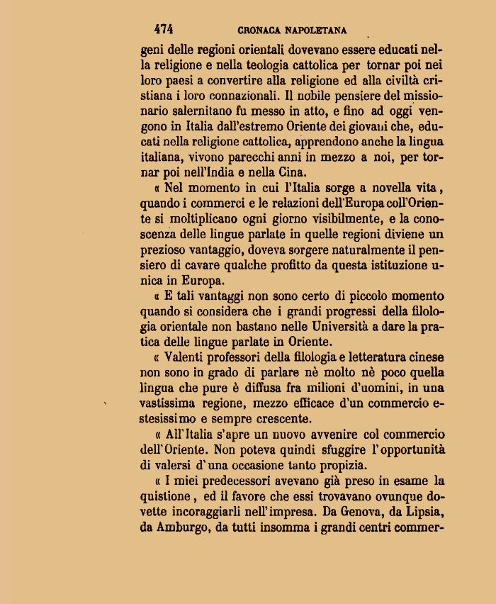 « Nel momento in cui l'Italia sorge a novella vita, quando i commerci e le relazioni dell'Europa coll'Orien-te si moltiplicano ogni giorno visibilmente, e la conoscenza delle lingue parlate in quelle regioni diviene un prezioso vantaggio, doveva sorgere naturalmente il pensiero di cavare qualche profitto da questa istituzione u-rJca in Europa.