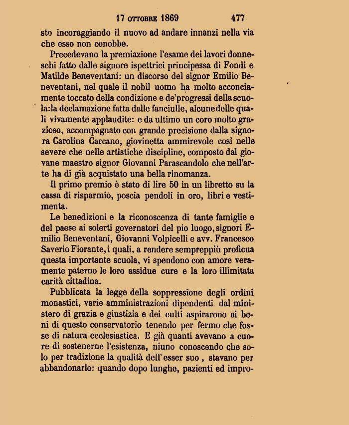 Precedevano la premiazione Tesarne dei lavori donneschi fatto dalle signore ispettrici principessa di Fondi e Matilde Beneventani: un discorso del signor Emilio Beneventani, nel quale il nobil uomo ha molto acconciamente toccato della condizione e de'progressi della scuola: la declamazione fatta dalle fanciulle, alcune delle quali vivamente applaudite: e da ultimo un coro molto grazioso, accompagnato con grande precisione dalla signora Carolina Carcano, giovinetta ammirevole così nelle severe che nelle artìstiche discipline, composto dal giovane maestro signor Giovanni Parascandolo che nell'arte ha di già acquistato una bella rinomanza.