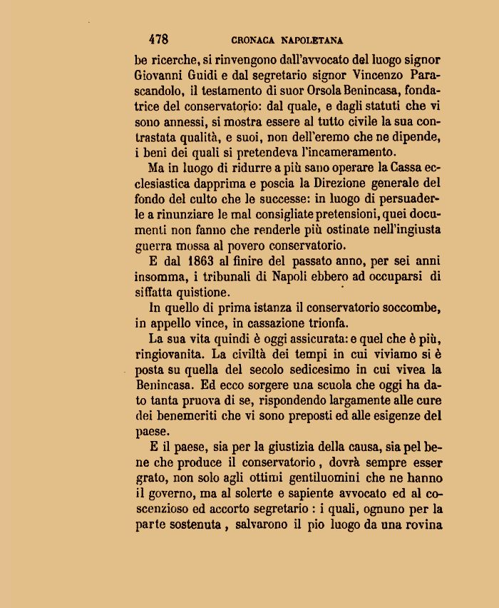 be ricerche, si rinvengono dall'avvocato del luogo signor Giovanni Guidi e dal segretario signor Vincenzo Para-scandolo, il testamento di suor Orsola Benincasa, fondatrice del conservatorio: dal quale, e dagli statuti che vi sono annessi, si mostra essere al tutto civile la sua contrastata qualità, e suoi, non dell'eremo che ne dipende, i beni dei quali si pretendeva l'incameramento.