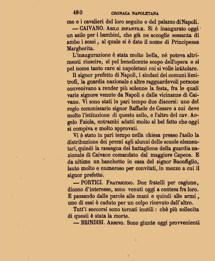 Vi è stato in pari tempo nella chiesa presso l'asilo la distribuzione dei premi agli alunni delle scuole elementari, quindi la rassegna del battaglione della guardia nazionale di Caivano comandato dal maggiore Capece. E da ultimo un banchetto in casa del signor Buonfigiio, lauto molto e numeroso per convitati, in mezzo a cui il signor prefetto.