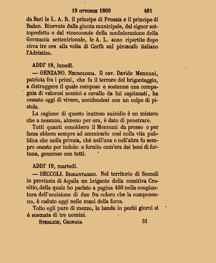 — GENZANO. Necrologia. Il cav. Davide Mennuni, patriota fra i primi, che fu il terrore del brigantaggio, a distruggere il quale compose e sostenne una compagnia di valorosi uomini a cavallo da lui capitanati, ha cessato oggi di vivere, uccidendosi con un colpo di pistola.