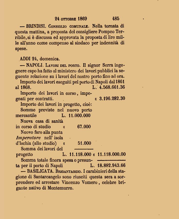 — BASILICATA. Brigantaggio. I carabinieri della stagione di Santarcangelo sono riusciti questa sera a sorprendere ed arrestare Vincenzo Vomero , celebre brigante nativo di Montemurro.