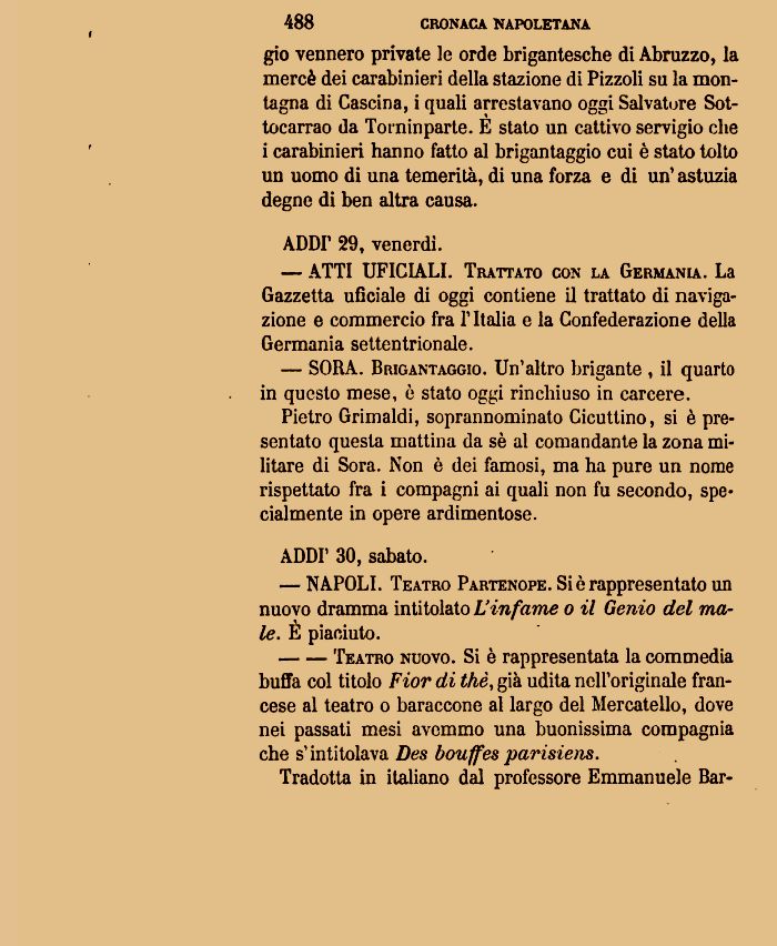 gio vennero private le orde brigantesche di Abruzzo, la mercè dei carabinieri della stazione di Pizzoli su la montagna di Cascina, i quali arrestavano oggi Salvatore Sot-tocarrao da Torninparte. E stato un cattivo servigio che i carabinieri hanno fatto al brigantaggio cui è stato tolto un uomo di una temerità, di una forza e di un' astuzia degne di ben altra causa.