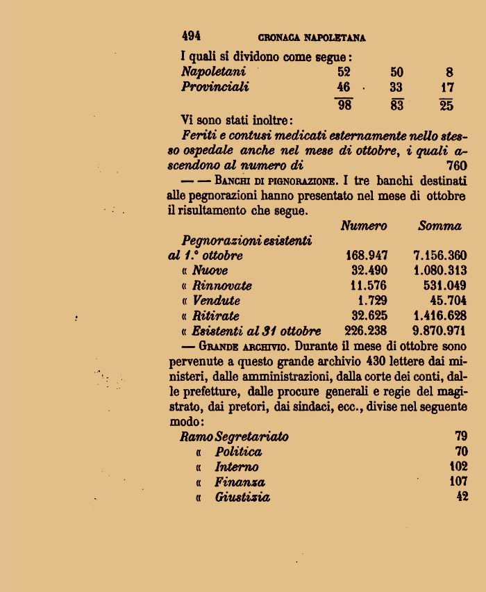 — Grande archivio. Durante il mese di ottobre sono pervenute a questo grande archivio 430 lettere dai ministeri, dalle amministrazioni, dalla corte dei conti, dalle prefetture, dalle procure generali e regie del magistrato, dai pretori, dai sindaci, ecc., divise nel seguente