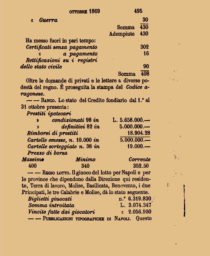 le province che dipendono dalla Direzione qui residente, Terra di lavoro, Molise, Basilicata, Benevento, i due Principati, le tre Calabrie e Molise, dà lo stato seguente. Biglietti giuocati n.° 6.319.830 Somma introitata L. 3.074.347 Vincite fatte dai giocatori « 2.056.930 --Pubblicazioni tipografiche di Napoli, Questo
