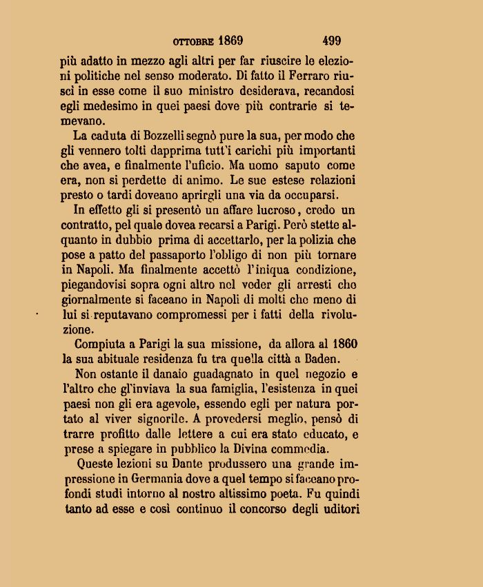 In effetto gli sì presentò un affare lucroso, credo un contratto, pel quale dovea recarsi a Parigi. Però stette alquanto in dubbio prima di accettarlo, per la polizia che pose a patto del passaporto l'obligo di non più tornare in Napoli. Ma finalmente accettò V iniqua condizione, piegandovisi sopra ogni altro nel veder gli arresti cho giornalmente si faceano in Napoli di molti che meno di lui si reputavano compromessi per i fatti della rivoluzione.