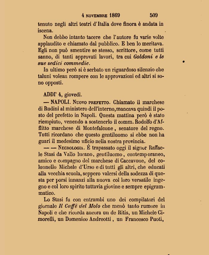 — — Necrologia. E trapassato oggi il signor Raffaele Stasi da Vallo lucano, gentiluomo, contemporaneo, amico e compagno del marchese di Caccavone, del colonnello Michele d'U'rso e di tutti gli altri, che educati alla vecchia scuola, seppero valersi della sodezza di questa per porsi innanzi alla nuova col loro versatile ingegno e col loro spirilo tuttavia giovine e sempre epigrammatico.
