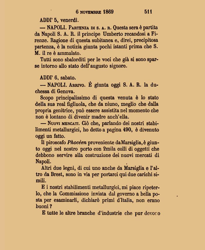 — NAPOLI. Partenza di s. a. r. Questa sera è partita da Napoli S. A. R. il principe Umberto recandosi a Firenze. Ragione di questa subitanea e, direi, precipitosa partenza, è la notizia giunta pochi istanti prima che S. M. il re è ammalato.