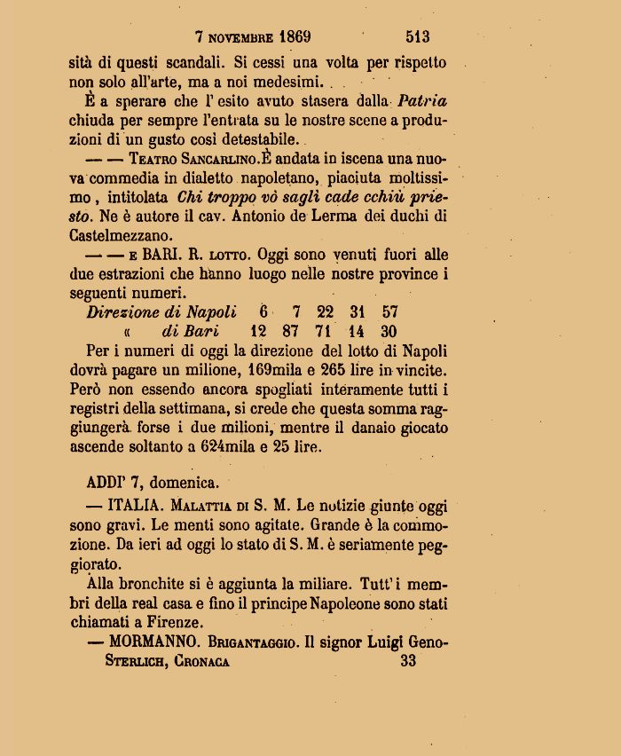 — ITALIA. Malattia di S. M. Le notizie giunte oggi sono gravi. Le menti sono agitate. Grande è la commozione. Da ieri ad oggi lo stato di S. M. è seriamente peggiorato.