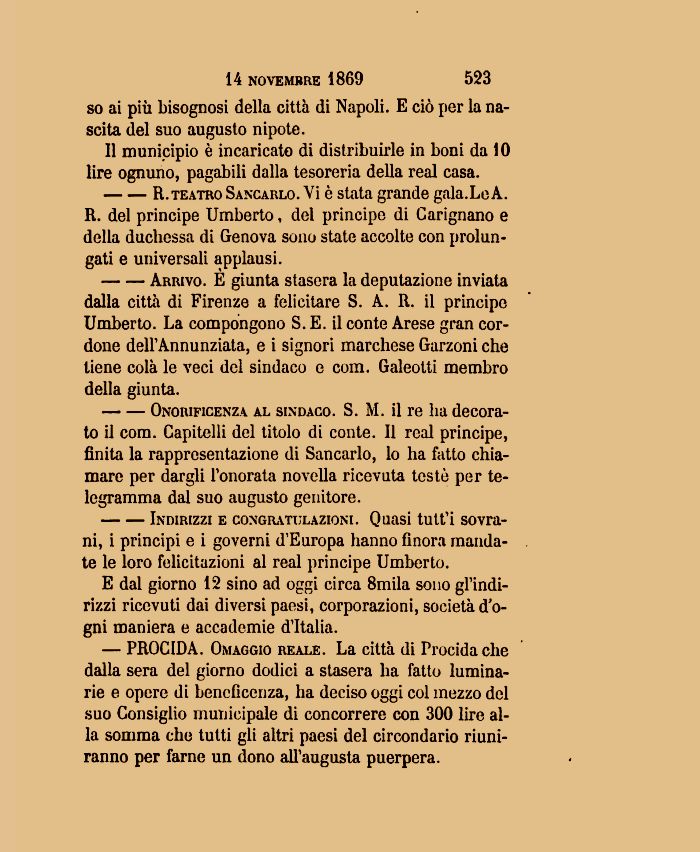 — PROGIDA. Omaggio reale. La città di Procidache dalla sera del giorno dodici a stasera ha fatto luminarie e opere di beneficenza, ha deciso oggi col mezzo del suo Consiglio municipale di concorrere con 300 lire alla somma che tutti gli altri paesi del circondario riuniranno per farne un dono all'augusta puerpera.