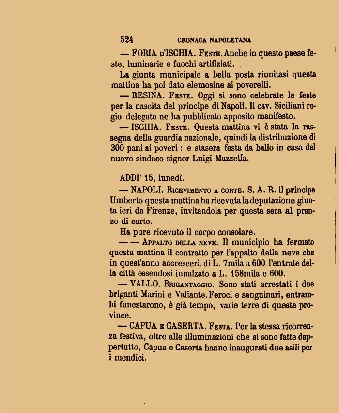 — RESINA. Feste. Oggi si sono celebrate le feste per la nascita del principe dì Napoli. Il cav. Siciliani regio delegato ne ha pubblicato apposito manifesto.