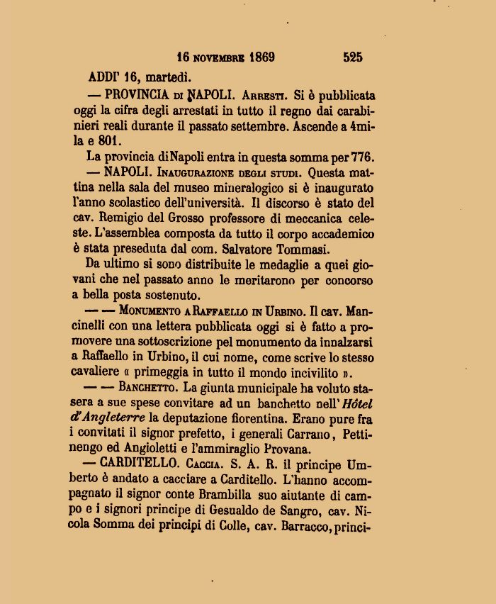 cinelli con una lettera pubblicata oggi si è fatto a pro-movere una sottoscrizione pel monumento da innalzarsi a Raffaello in Urbino, il cui nome, come scrive lo stesso cavaliere « primeggia in tutto il mondo incivilito ».