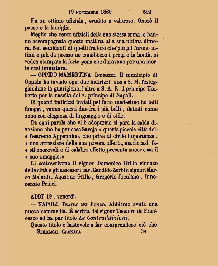 — OPPIDO MAMERTINA. Indirizzi. Il municipio di Oppido ha inviato oggi due indirizzi: uno a S. M. festeggiandone la guarigione, l'altro a S. A. R. il principe Umberto per la nascita del r. principe di Napoli.