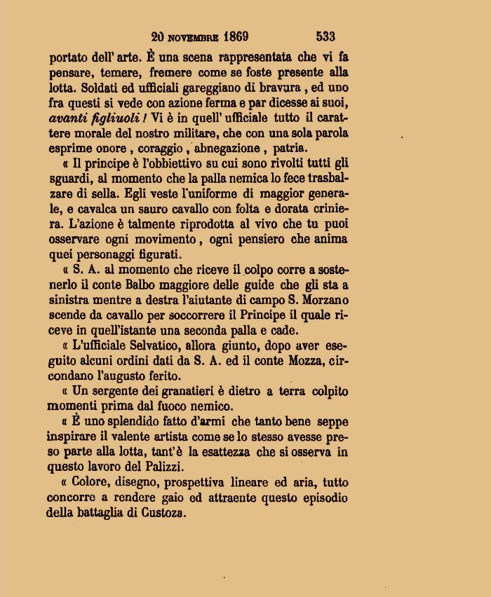 portato dell' arte. È una scena rappresentata che vi fa pensare, temere, fremere come se foste presente alla lotta. Soldati ed ufficiali gareggiano di bravura, ed uno fra questi si vede con azione ferma e par dicesse ai suol, avanti figliuoli / Vi è in queir ufficiale tutto il carattere morale del nostro militare, che con una sola parola esprime onore , coraggio / abnegazione , patria.