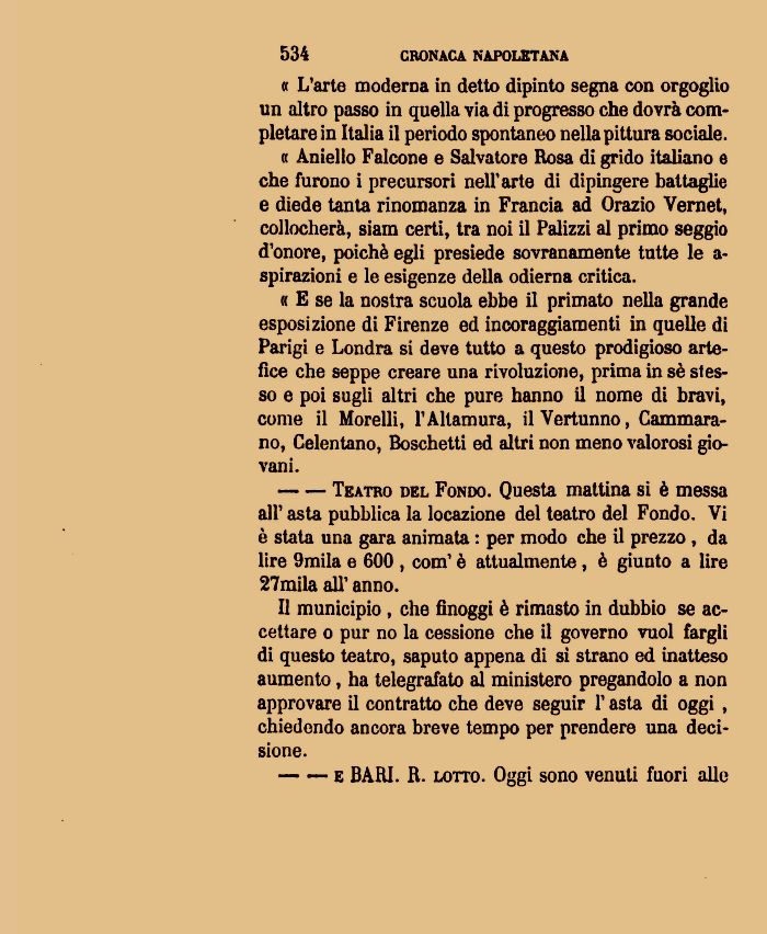 « Amelio Falcone e Salvatore Rosa di grido italiano e che furono i precursori nell'arte di dipingere battaglie e diede tanta rinomanza in Francia ad Orazio Vernet, collocherà, siam certi, tra noi il Palizzi al primo seggio d'onore, poiché egli presiede sovranamente tutte le a-spiraziom e le esigenze della odierna critica.
