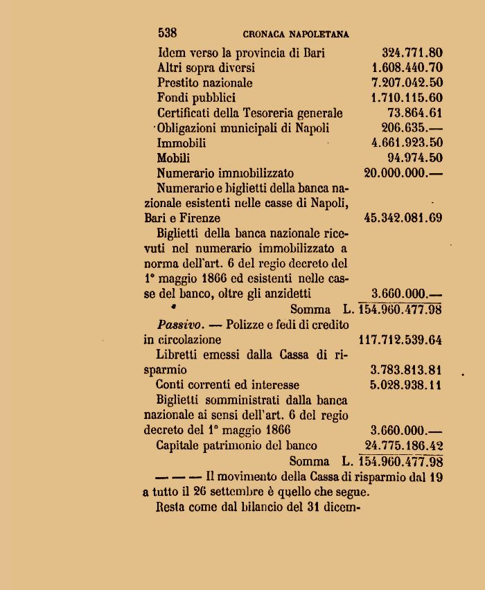 Libretti emessi dalla Cassa di risparmio 3.783.813.81 Conti correnti ed interesse 5.028.938.11 Biglietti somministrati dalla banca nazionale ai sensi dell1 art. 6 del regio decreto del 1° maggio 1866 3.660.000.— Capitale patrimonio del banco 24.775.186.42