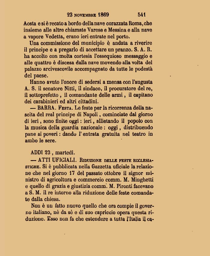 — ATTI UFICIALI. Riduzione delle feste ecclesiastiche. Si è pubblicata nella Gazzetta uficiale la relazione che nel giorno 17 del passato ottobre il signor ministro di agricoltura e commercio comm. M. Minghetti e quello di grazia e giustizia comm'. M. Pironti facevano a S. M. il re intorno alla riduzione delle feste comandate dalla chiesa.
