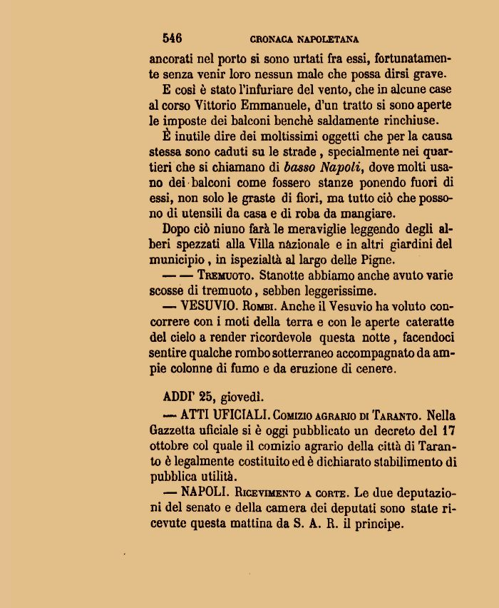 — VESUVIO. Rombi. Anche il Vesuvio ha voluto concorrere con i moti della terra e con le aperte cateratte del cielo a render ricordevole questa notte , facendoci sentire qualche rombo sotterraneo accompagnato da ampie colonne di fumo e da eruzione di cenere.