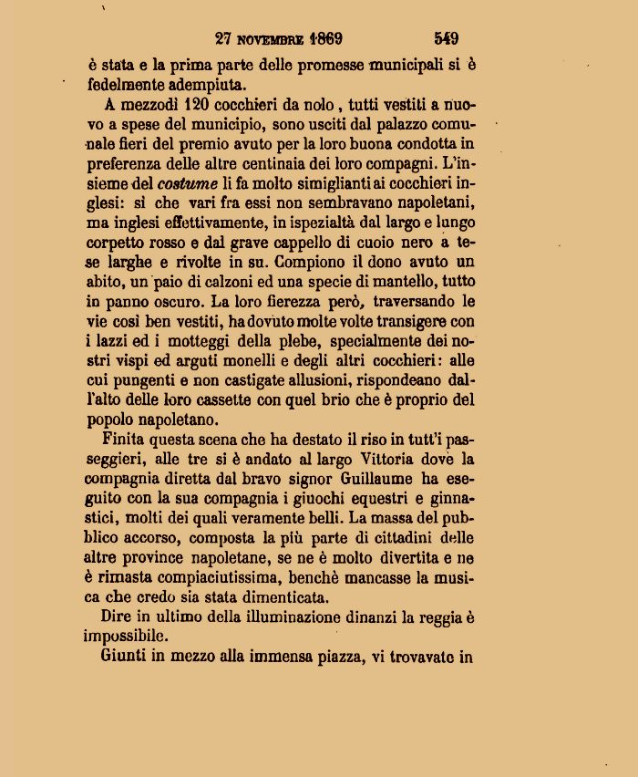 A mezzodì 120 cocchieri da nolo, tutti vestiti a nuovo a spese del municipio, sono usciti dal palazzo comunale fieri del premio avuto per la loro buona condotta in preferenza delle altre centinaia dei loro compagni L'insieme del costume li fa molto simiglianti ai cocchieri inglesi: sì che vari fra essi non sembravano napoletani, ma inglesi effettivamente, in ispezialtà dal largo e lungo corpetto rosso e dal grave cappello di cuoio nero a tese larghe e rivolte in su. Compiono il dono avuto un abito, uri paio di calzoni ed una specie di mantello, tutto in panno oscuro. La loro fierezza però, traversando le vie così ben vestiti, ha dovuto molte volte transìgere con i lazzi ed i motteggi della plebe, specialmente dei nostri vispi ed arguti monelli e degli altri cocchieri : alle cui pungenti e non castigate allusioni, rispondeano dall'alto delle loro cassette con quel brio che è proprio del popolo napoletano.