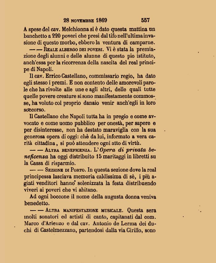Il Castellano che Napoli tutta ha in pregio e come avvocato e come uomo pubblico per onestà, per sapere e per disinteresse, non ha destato maraviglia con la sua generosa opera dì oggi: chè da lui, informato a vera carità cittadina, si può attendere ogni atto di virtù.