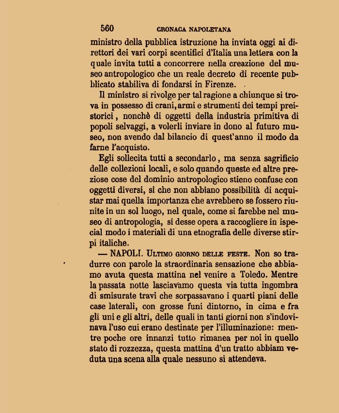 Egli sollecita tutti a secondarlo, ma senza sagrificio delle collezioni locali, e solo quando queste ed altre preziose cose del dominio antropologico stieno confuse con oggetti diversi, sì che non abbiano possibilità di acquistar mai quella importanza che avrebbero se fossero riunite in un sol luogo, nel quale, come si farebbe nel museo di antropologia, si desse opera a raccogliere in ispe-cial modo i materiali di una etnografia delle diverse stirpi italiche.