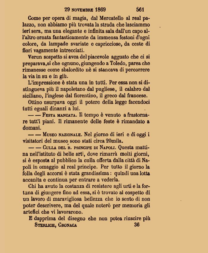--Culla del r. principe di Napoli. Questa mattina nell'istituto di belle art', dove rimarrà molti giorni, si è esposta al pubblico la culla offerta dalla città di Napoli in omaggio al real principe. Per tutto il giorno la folla degli accorsi è stata grandissima : quindi una lotta accanita e continua per entrare a vederla.
