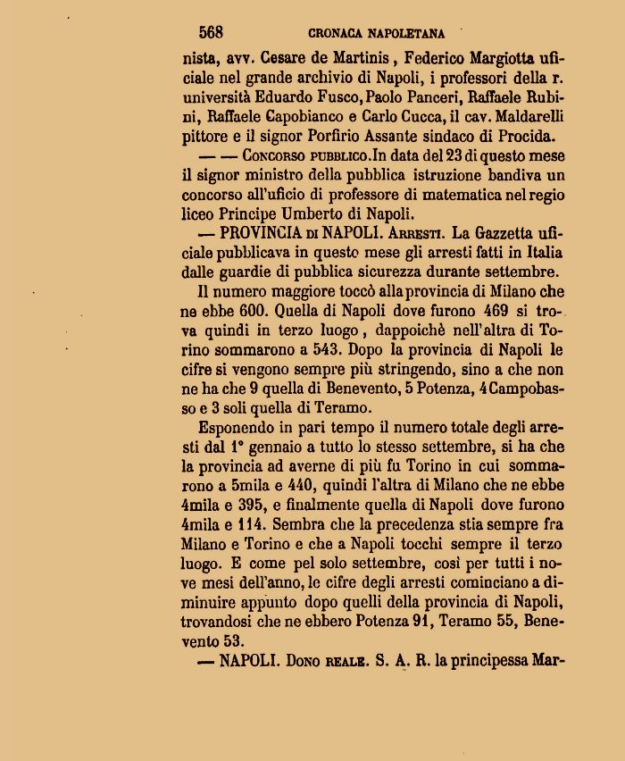 Il numero maggi ore toccò alla provincia di Milano che ne ebbe 600. Quella eli Napoli dove furono 469 si trova quindi in terzo luogo, dappoiché nell'altra dì Torino sommarono a 543. Dopo la provincia di Napoli le cifre si vengono sempre più stringendo, sino a che non ne ha che 9 quella di Benevento, 5 Potenza, 4 Campobasso e 3 soli quella di Teramo.